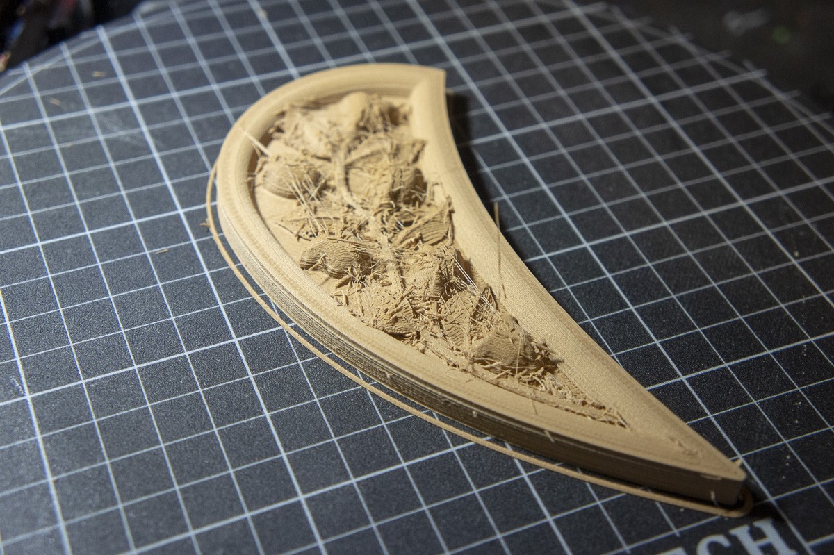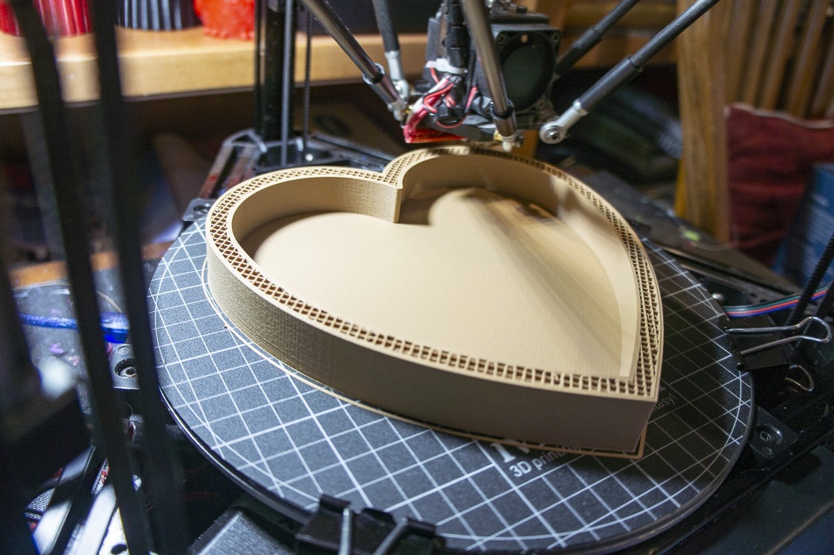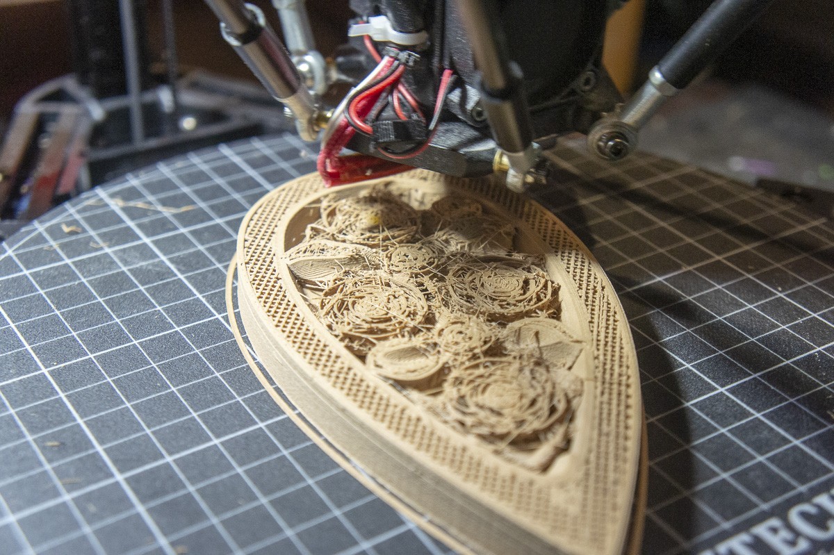 The bottom is finished printing after almost 16 hours. Looks good! A light sanding and it will be ready for the finish application. The Kossel Delta printer is doing a super job.