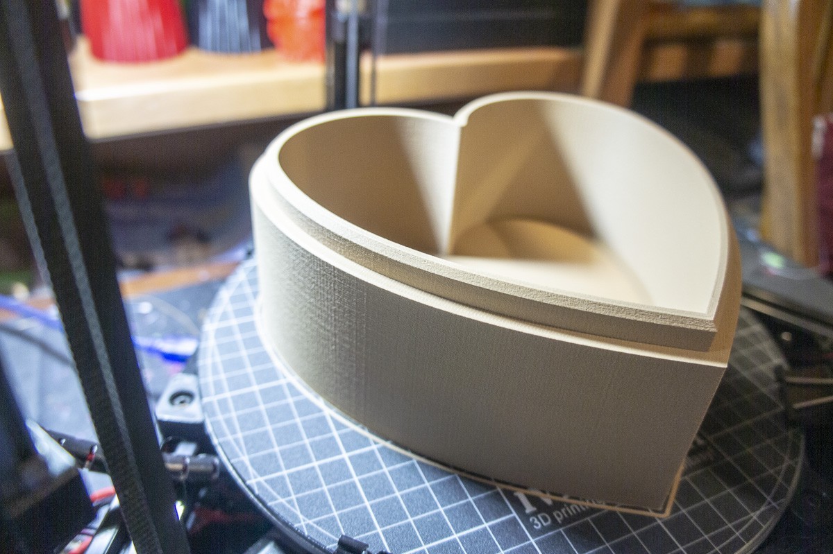 Trial fit of the top shows all is well. Not a tight press fit, but easy on and off without being "loose". This is a full size print so resizing may affect lid fit. Gaps resize the same as the resize proportions. I am now printing the flowers! Very cool!