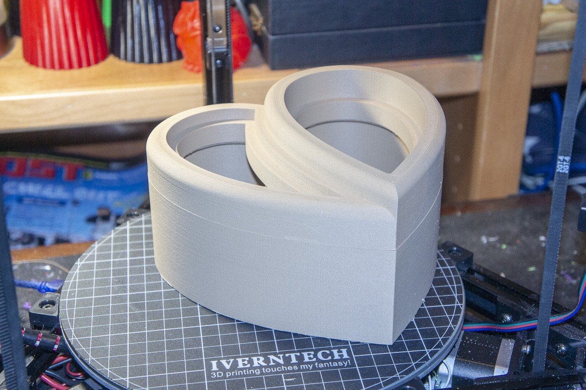 The top shown in the picture took almost 11 hours to print. The bottom is now on the printer and will run for about 16 hours. More info on this project will be coming...